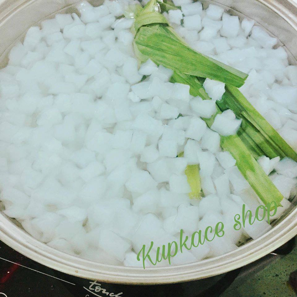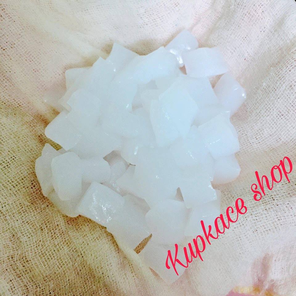 - Thạch dừa khô mua về ngâm với nước tối thiểu 1 tiếng, tối đa bao nhiêu cũng được. Thạch khô sẽ ngậm nước và bung ra nên 200gr thạch khô mọi người ngâm khoảng 3L nước